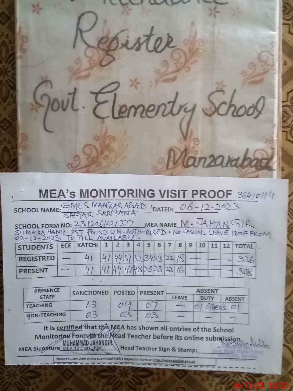 | Attendance Register | Head Teacher | MEA with School | Visit Proof |