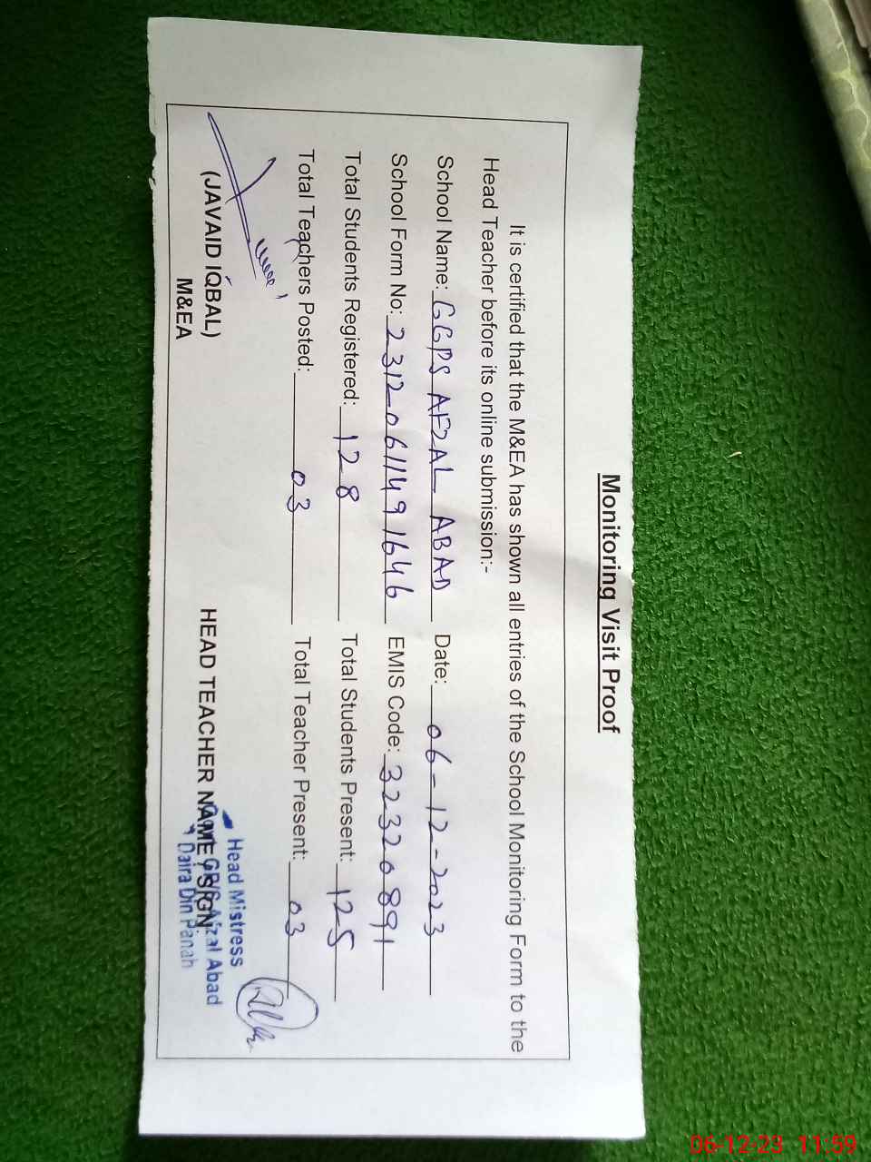 | EMIS Code: 32320891 | Name of School: GGPS AFZAL ABAD | |||