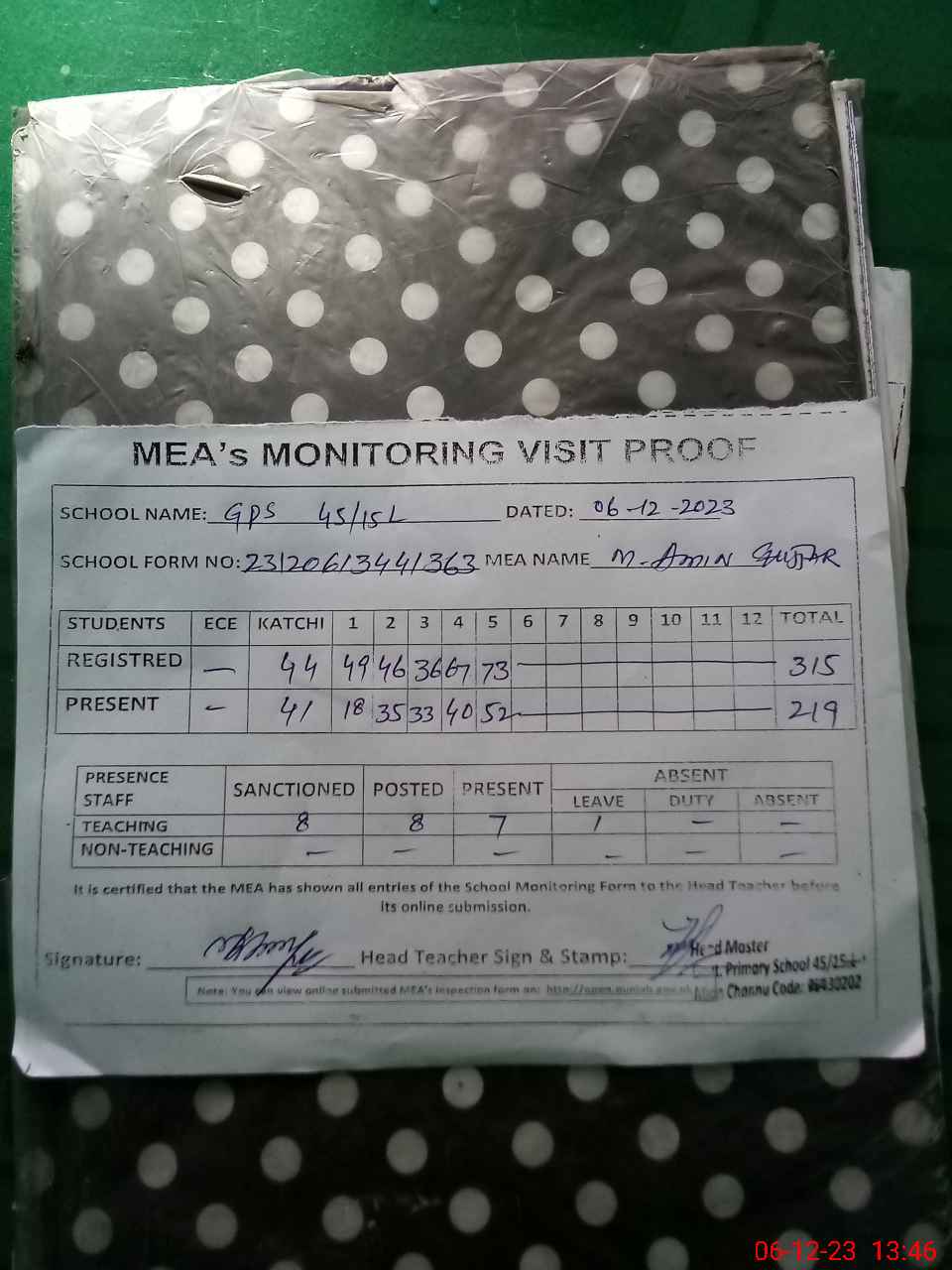 | Name: GH**** ME**** Designation: (School Headmaster's/Headmistress's) PTC/JV Phone/Cell Number: 03**** |
