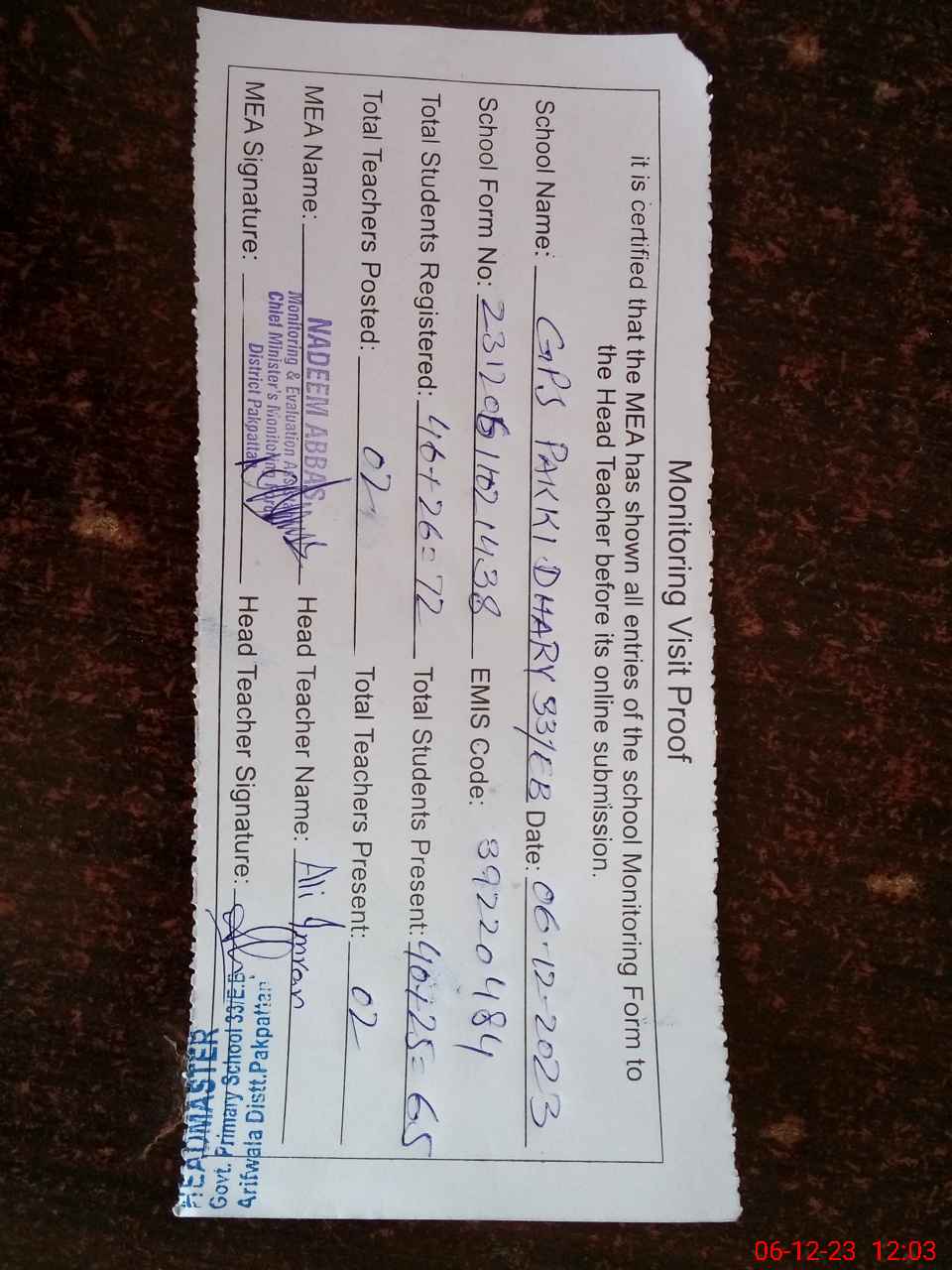 | EMIS Code: 39220484 | Name of School: GPS PAKKI DHARY DAKHLI CHAK NO. 33 EB | |||
