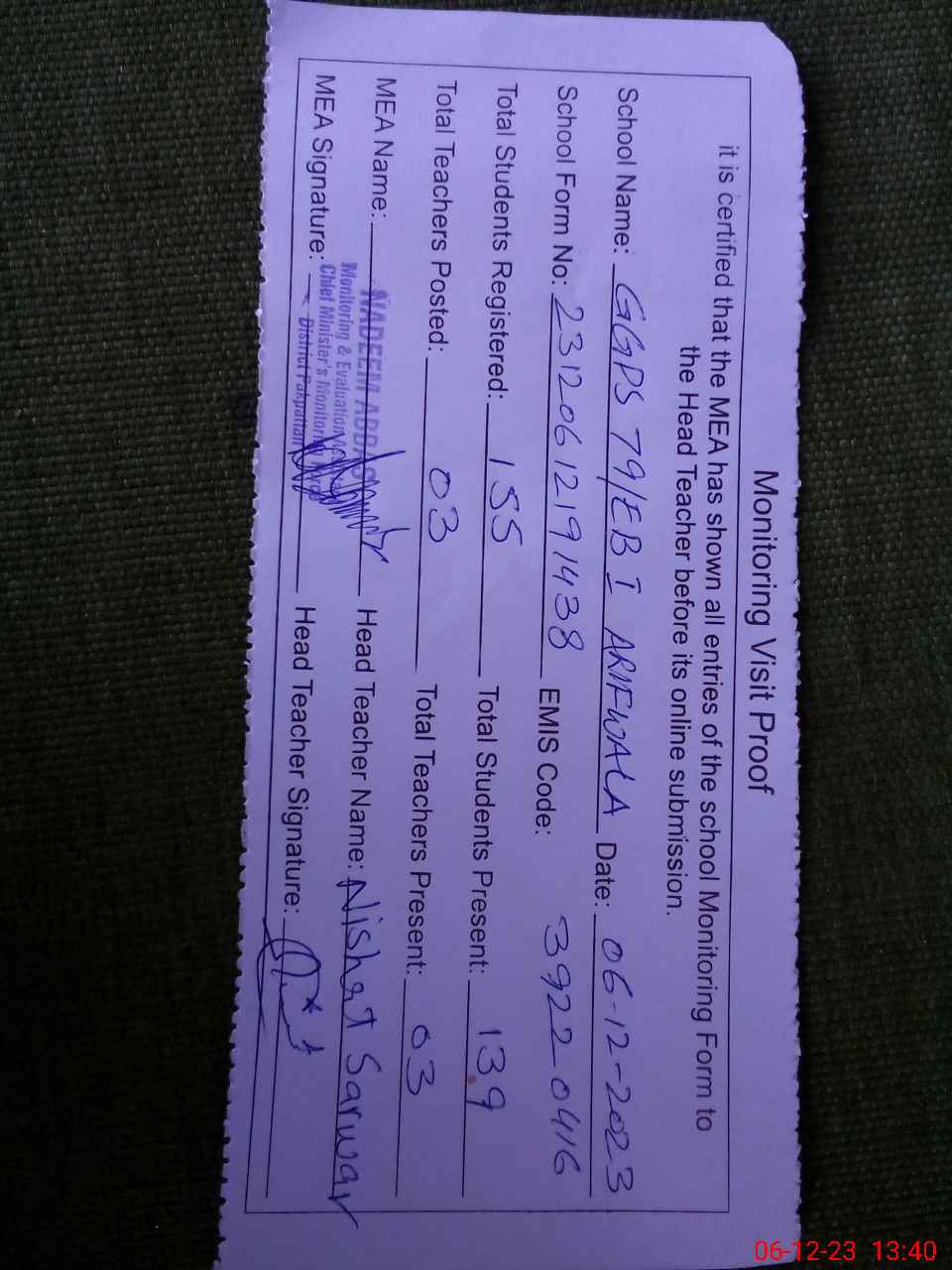 | EMIS Code: 39220416 | Name of School: GGPS 79/EB-I ARIFWALA | |||