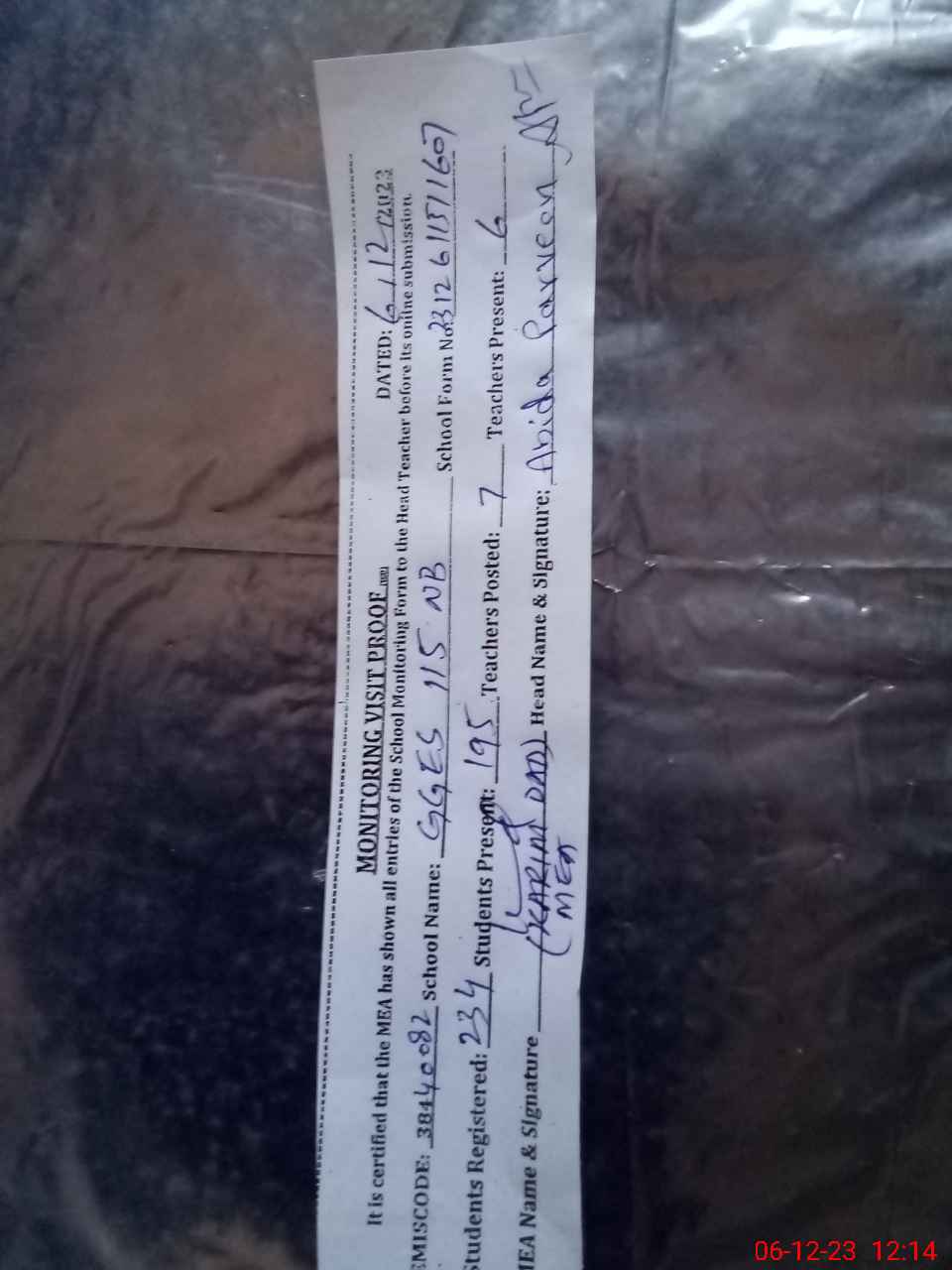 | Name: Ab**** Pa**** Designation: (School Headmaster's/Headmistress's) EST G Phone/Cell Number: 03**** |
