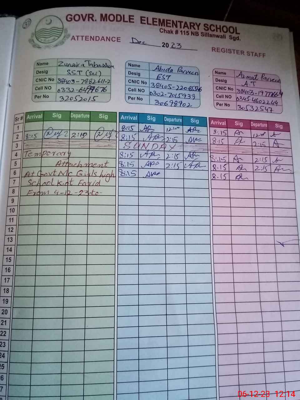 | CNIC | Full Name | Designation | R/C | Absence During Last Calender Month |