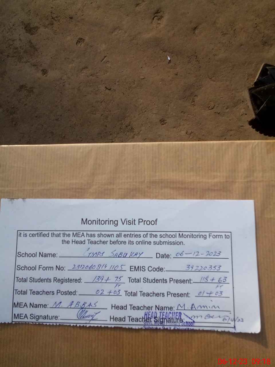| Attendance Register | Head Teacher | MEA with School | Visit Proof |
