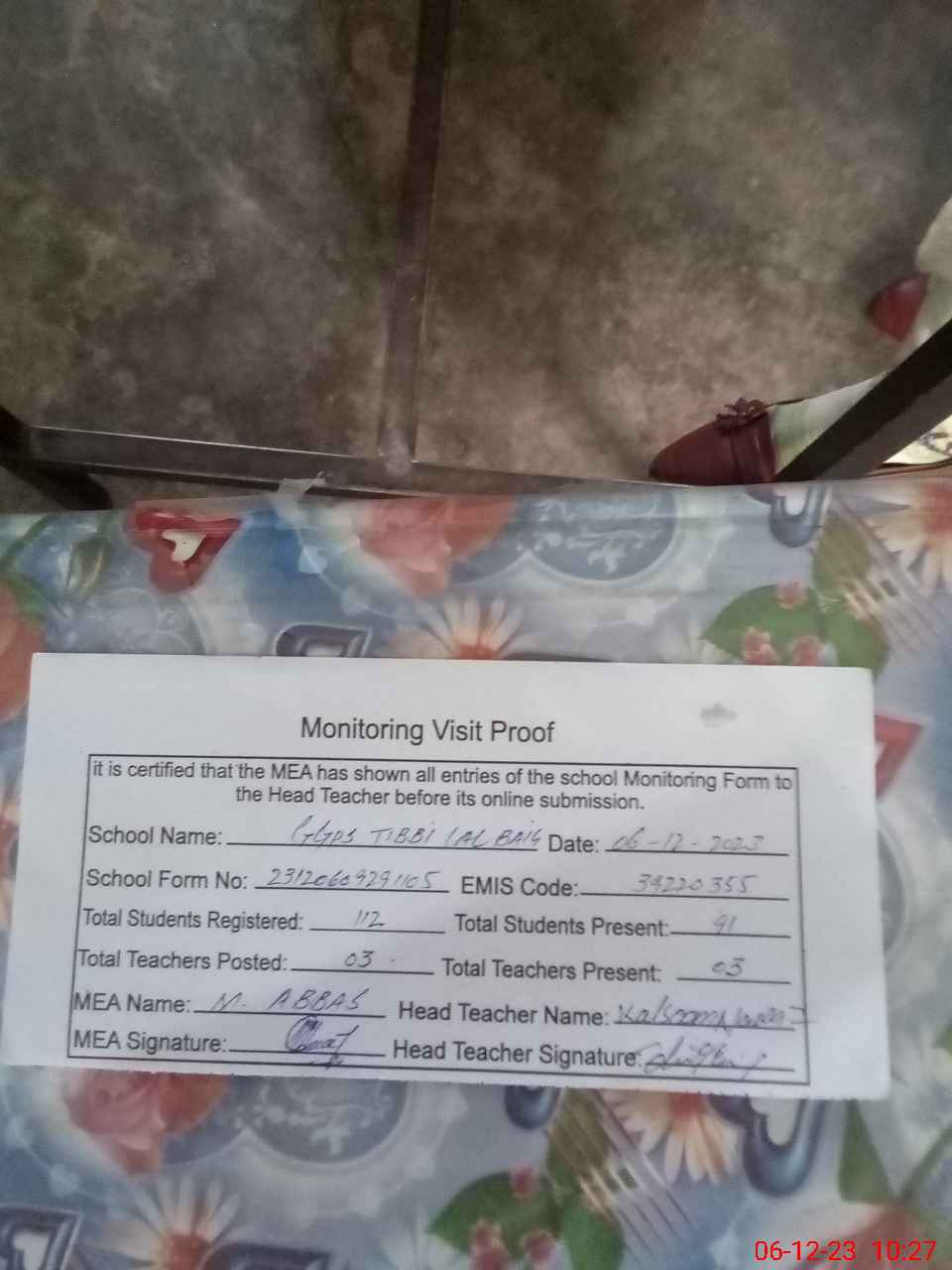 | Attendance Register | Head Teacher | MEA with School | Visit Proof |
