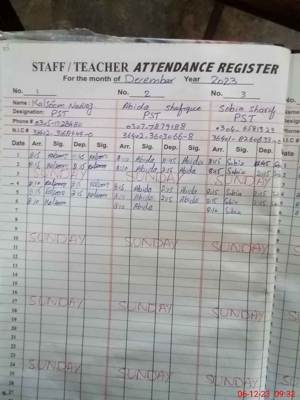 | CNIC | Full Name | Designation | R/C | Absence During Last Calender Month |
