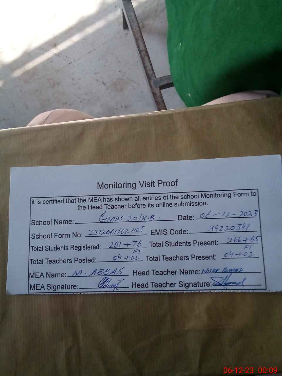 | EMIS Code: 39220347 | Name of School: GMPS CHAK NO. 20 KB | |||