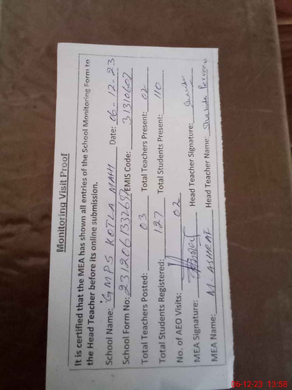 | EMIS Code: 31310607 | Name of School: GMPS KOTLA MAHI | |||