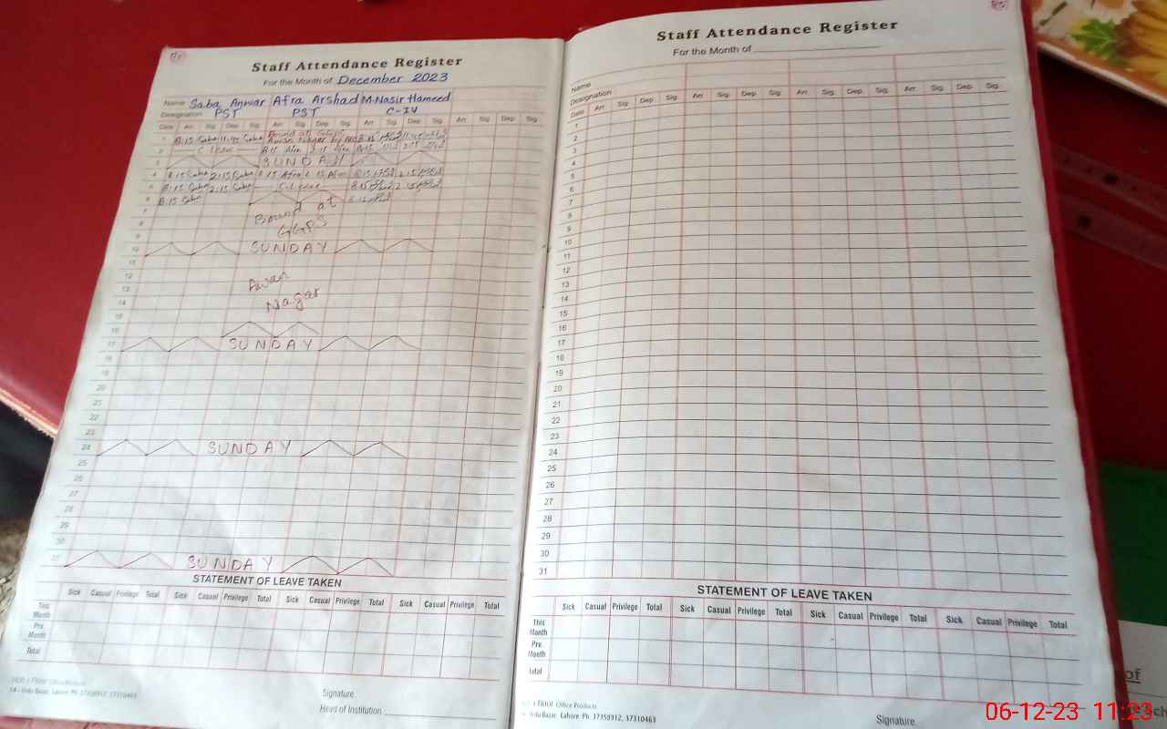 | CNIC | Full Name | Designation | R/C | Absence During Last Calender Month |