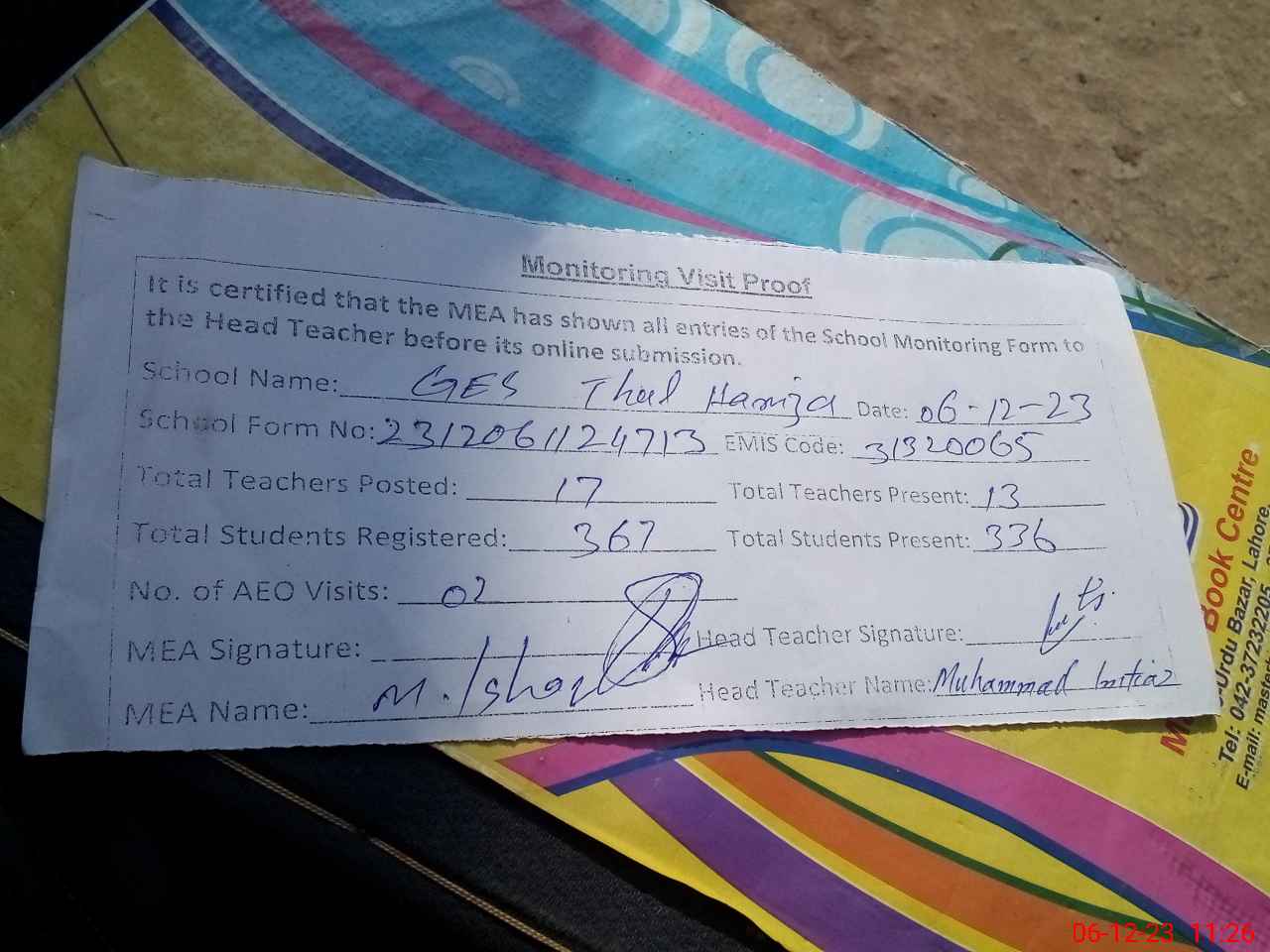 | Attendance Register | Head Teacher | MEA with School | Visit Proof |