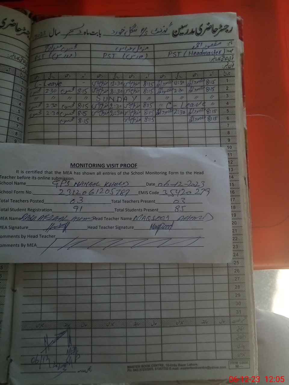 | Attendance Register | Head Teacher | MEA with School | Visit Proof |