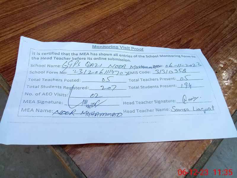 | EMIS Code: 31310358 | Name of School: GGPS QAZI NOOR MOHAMMAD | |||