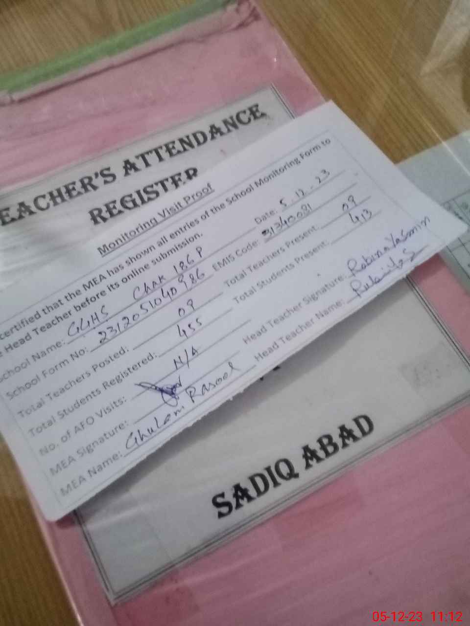 | Attendance Register | Head Teacher | MEA with School | Visit Proof |