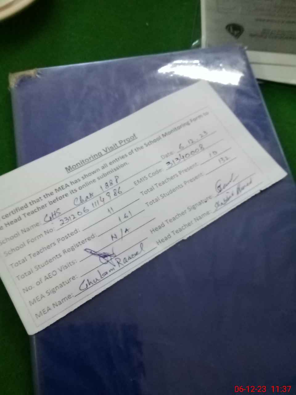 | Attendance Register | Head Teacher | MEA with School | Visit Proof |