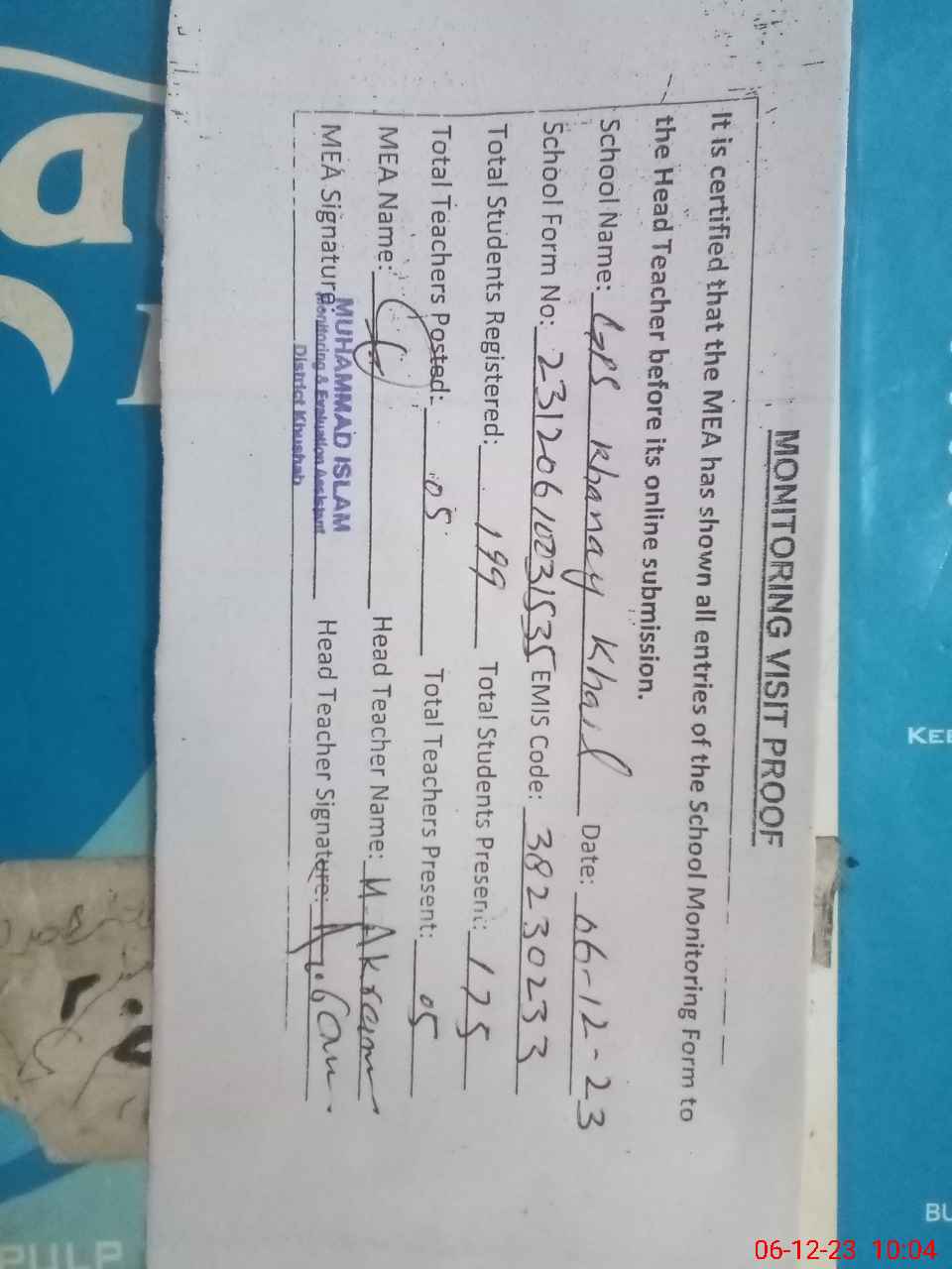 | Attendance Register | Head Teacher | MEA with School | Visit Proof |
