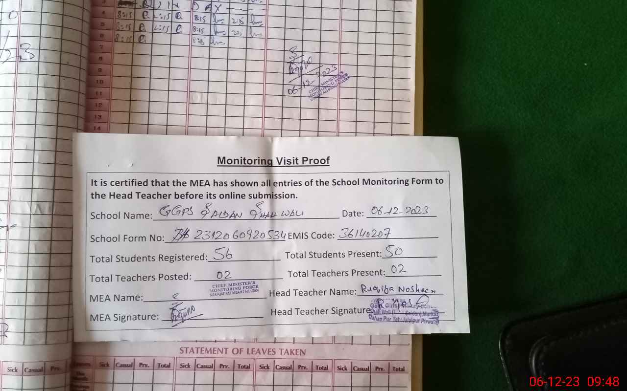 | Attendance Register | Head Teacher | MEA with School | Visit Proof |