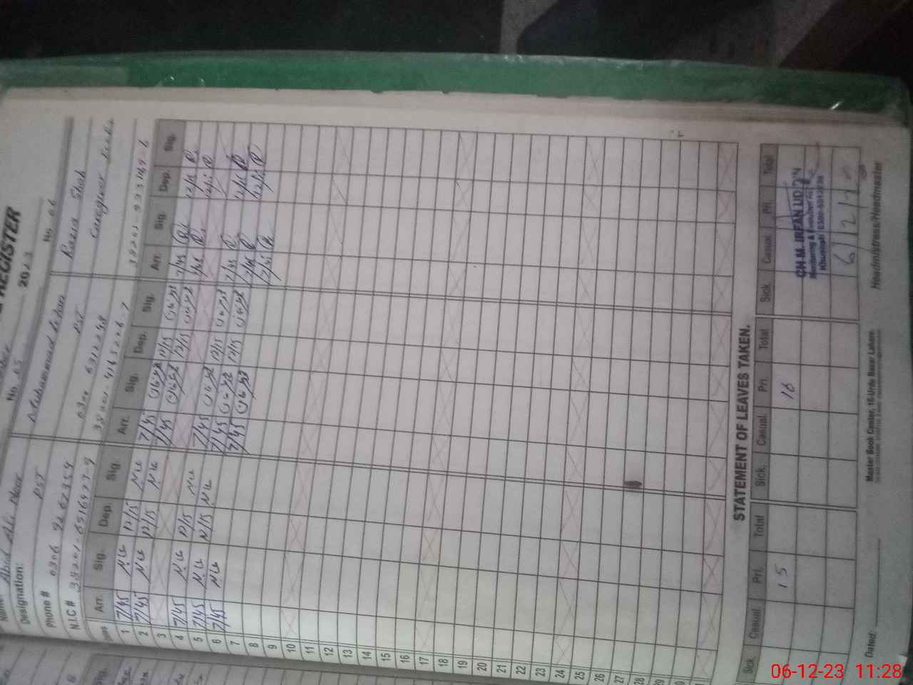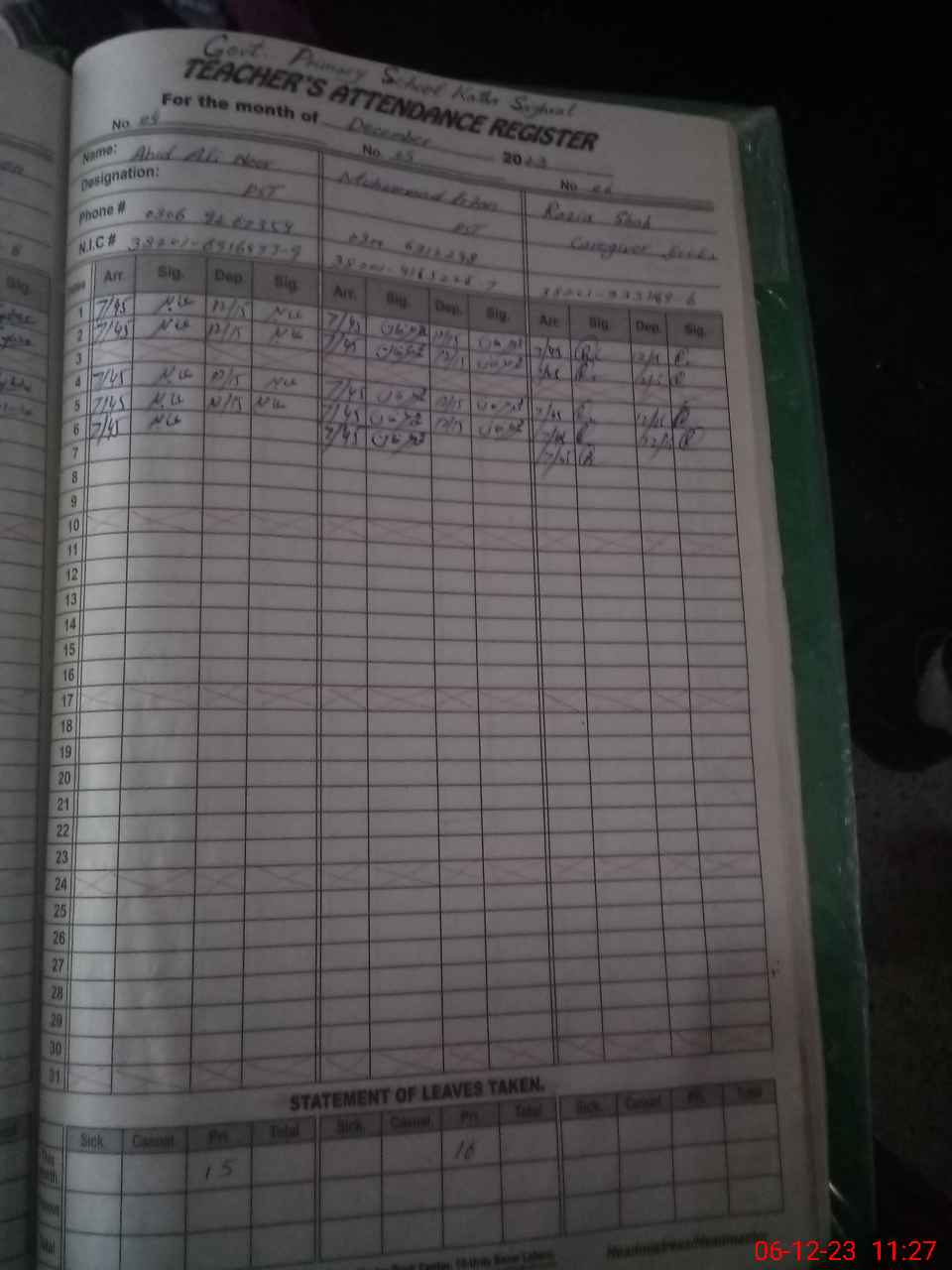 | CNIC | Full Name | Designation | R/C | Absence during last cal. month |