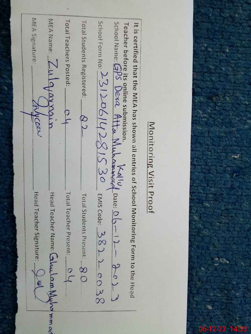 | EMIS Code: 38220038 | Name of School: GPS DERA ATTA MUHAMMAD KALOO | |||