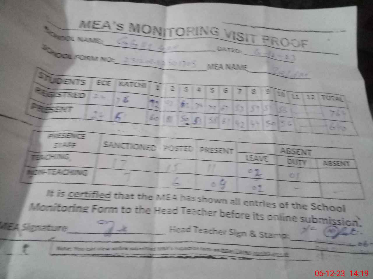 | Attendance Register | Head Teacher | MEA with School | Visit Proof |