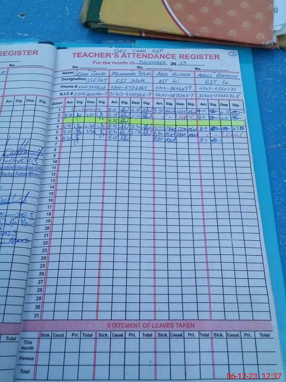 | CNIC | Full Name | Designation | R/C | Absence during last cal. month |