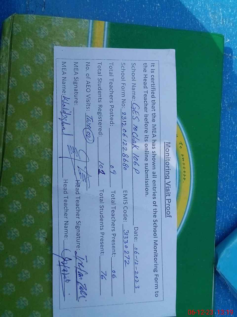 | Attendance Register | Head Teacher | MEA with School | Visit Proof |