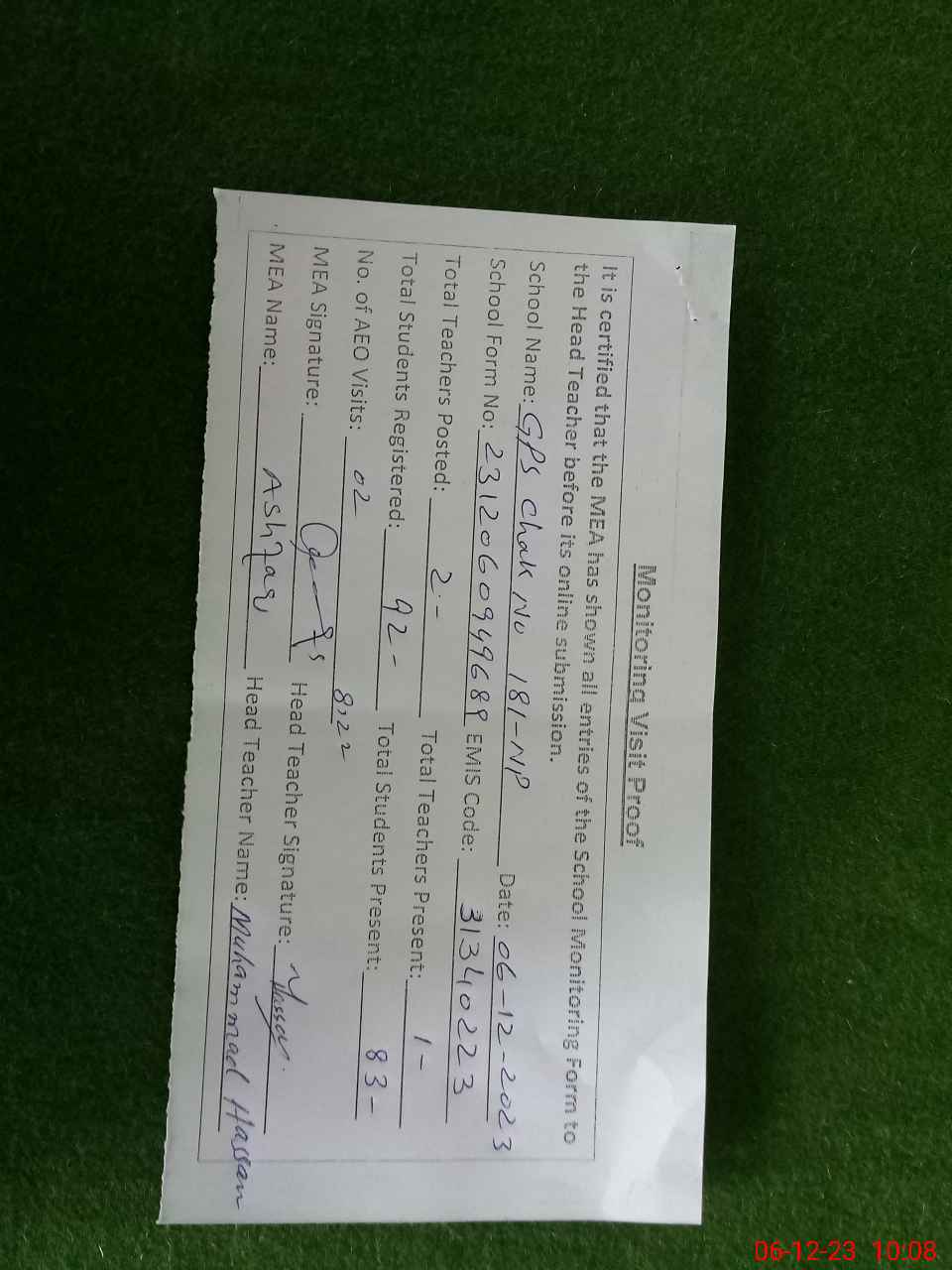 | EMIS Code: 31340223 | Name of School: GPS CHAK NO 181 NP | |||