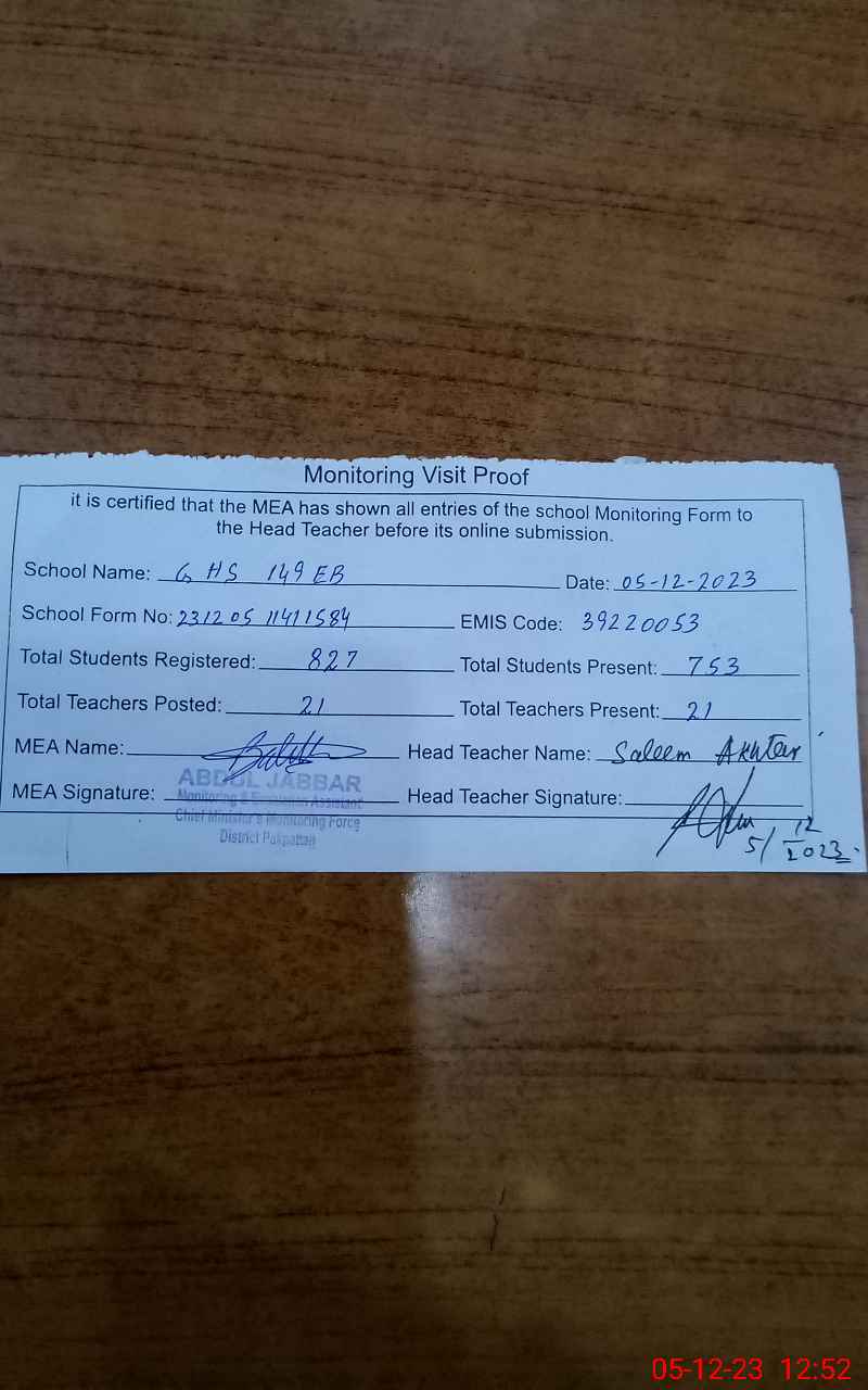 | EMIS Code: 39220053 | Name of School: GHS 149 EB ARIF WALA | |||