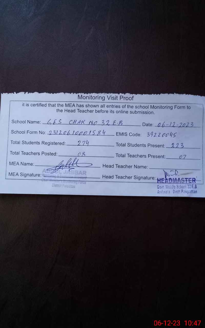 | EMIS Code: 39220045 | Name of School: GES CHAK NO. 32 / EB | |||