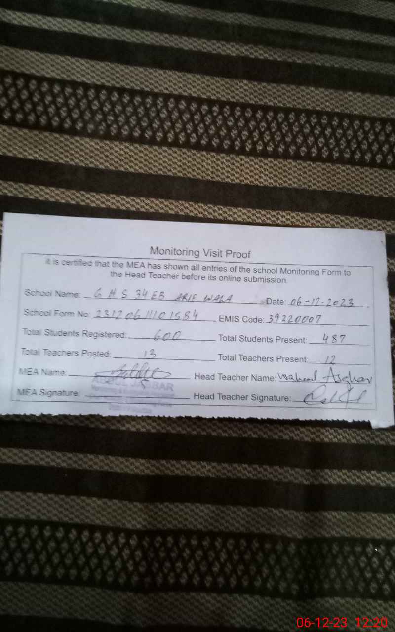 | EMIS Code: 39220007 | Name of School: GHS 34 EB ARIF WALA | |||