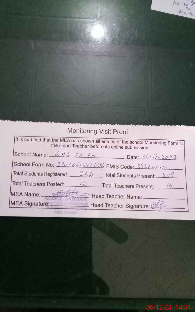 | EMIS Code: 39220010 | Name of School: GHS 28 EB TEH ARIF WALA | |||