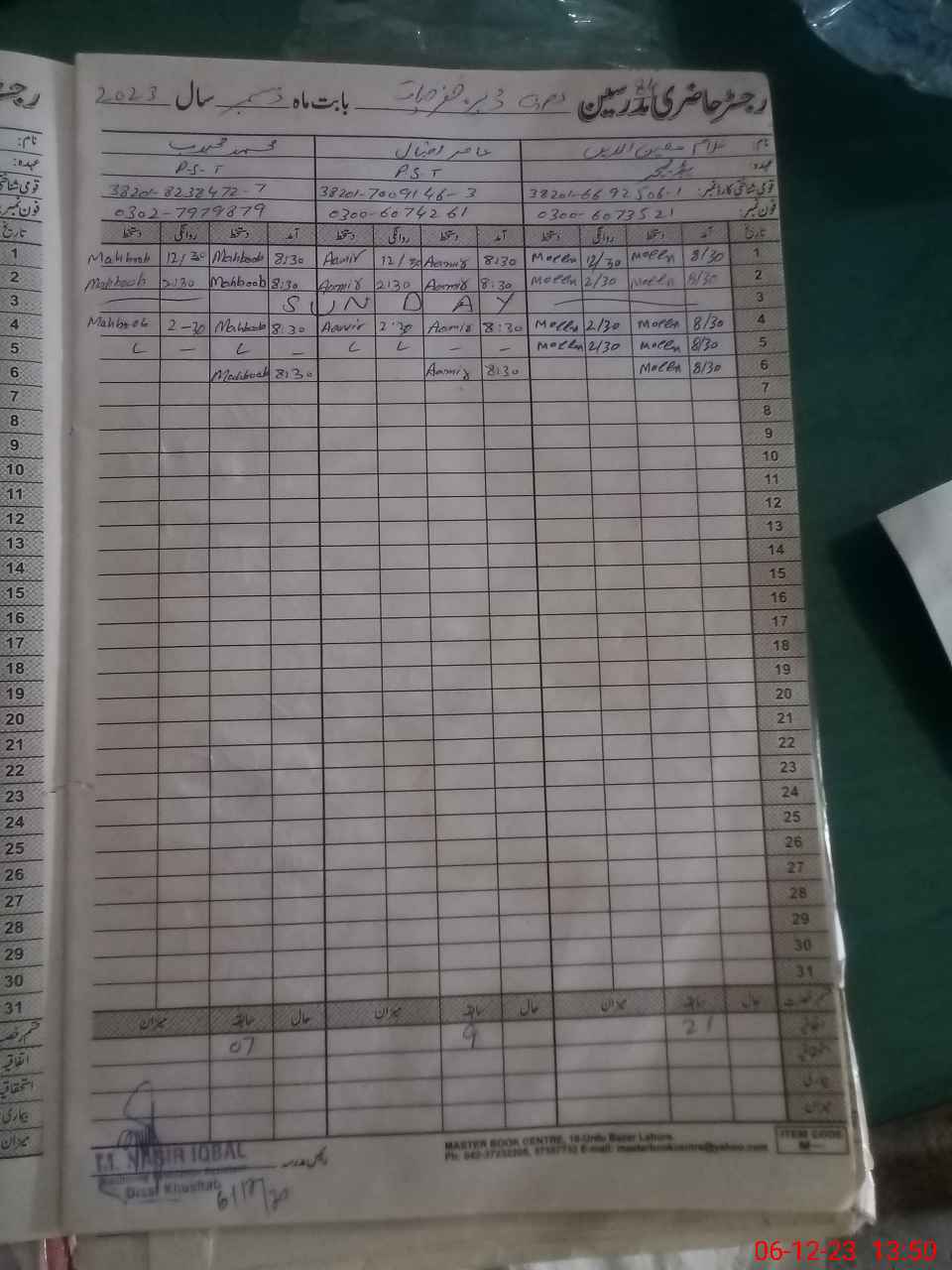 | CNIC | Full Name | Designation | R/C | Absence During Last Calender Month |