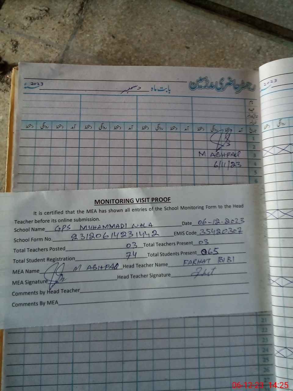 | Attendance Register | Head Teacher | MEA with School | Visit Proof |
