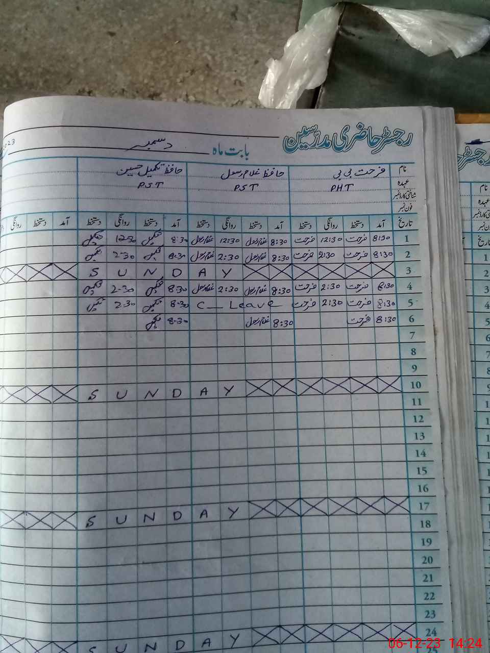 | CNIC | Full Name | Designation | R/C | Absence During Last Calender Month |