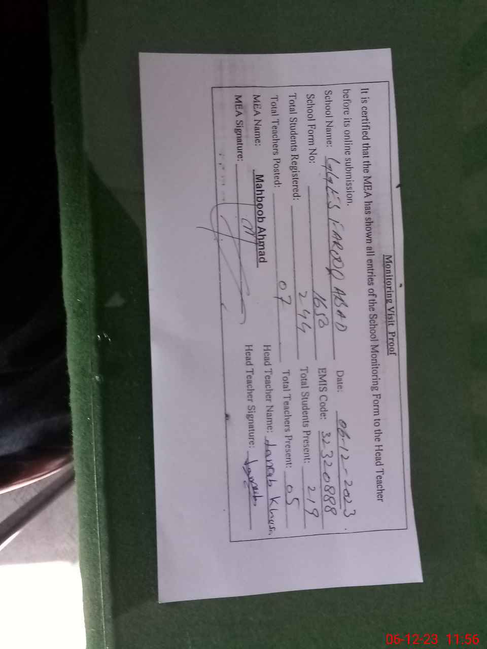 | Attendance Register | Head Teacher | MEA with School | Visit Proof |