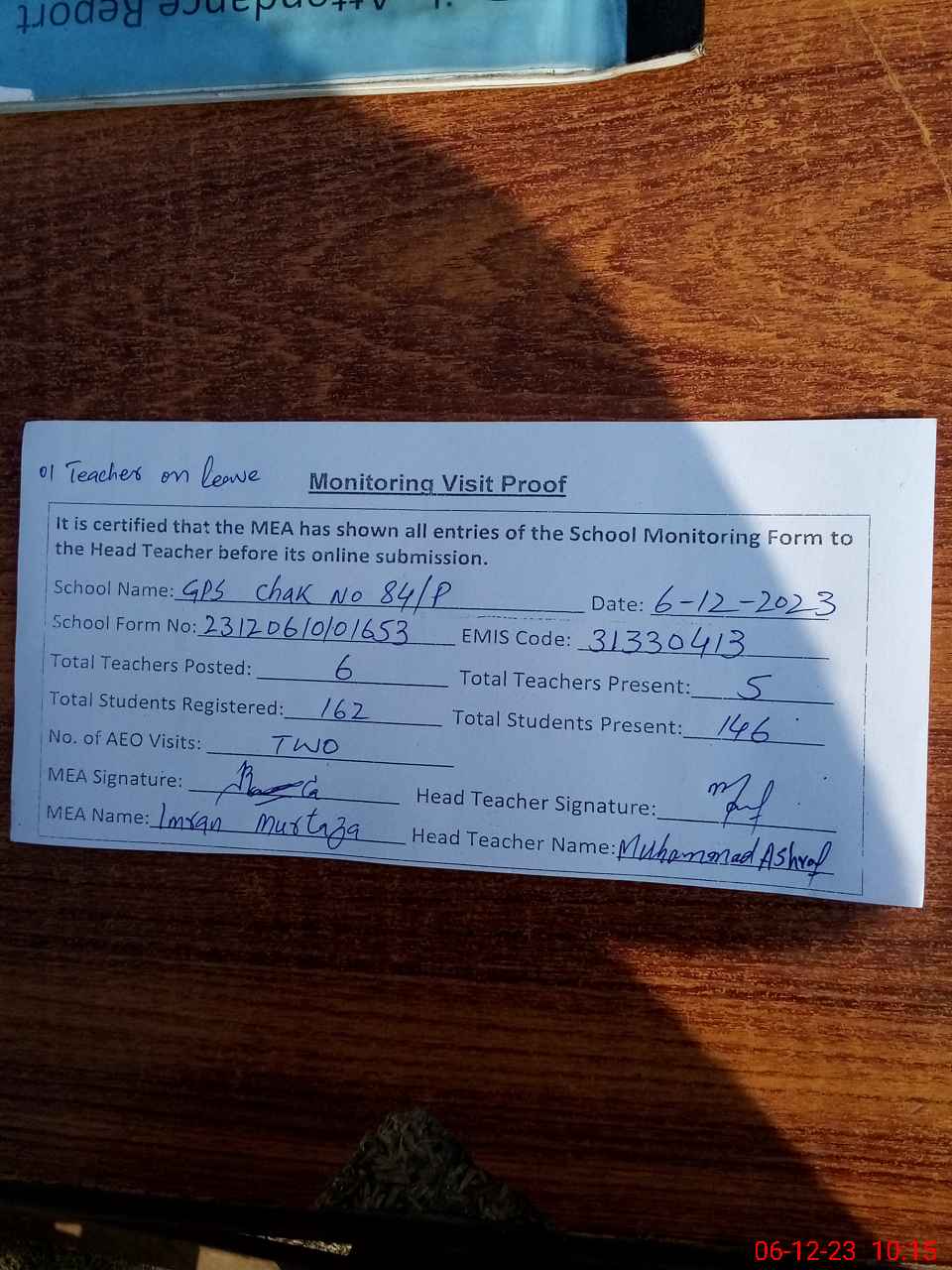 | Attendance Register | Head Teacher | MEA with School | Visit Proof |