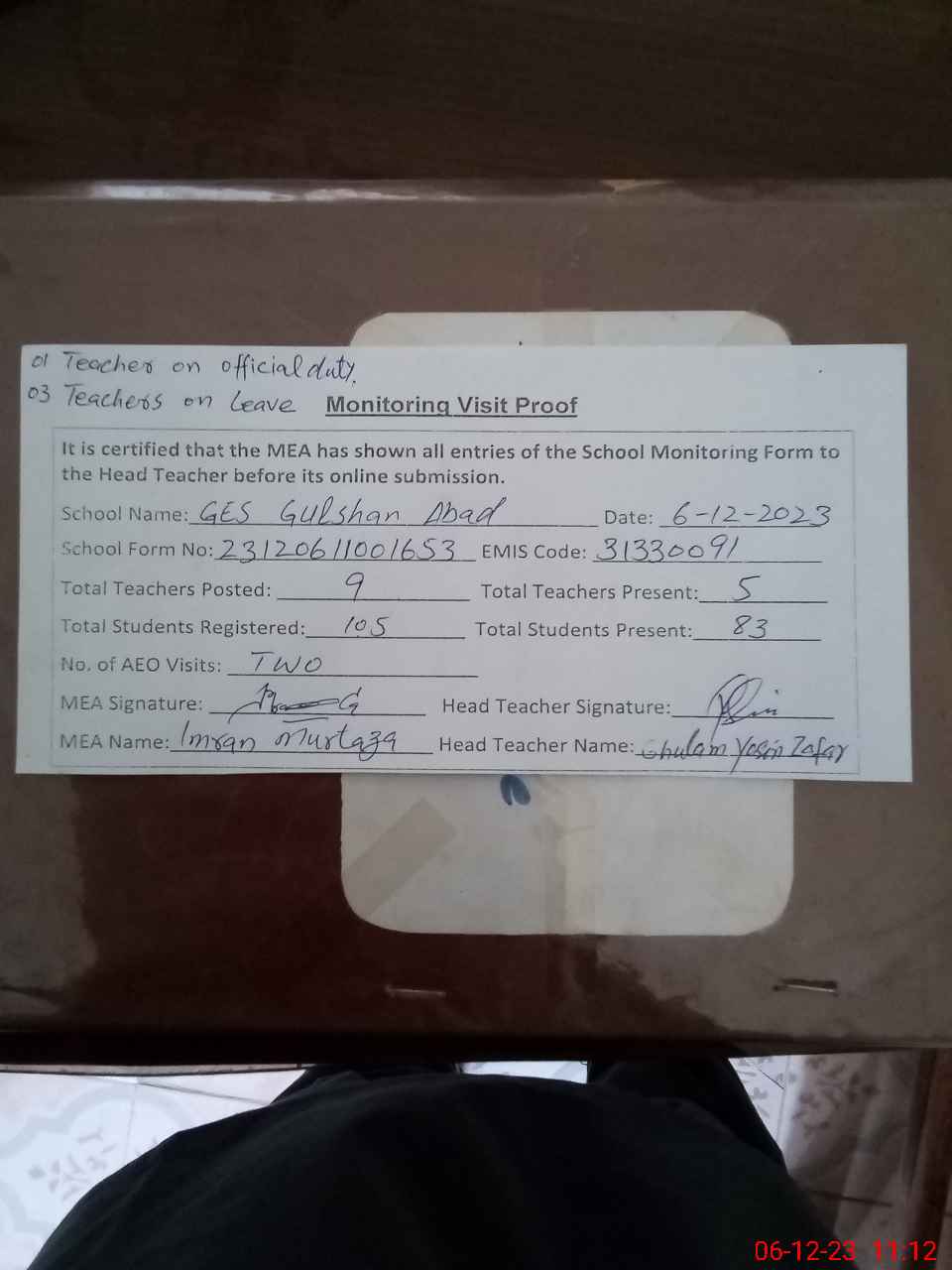 | EMIS Code: 31330091 | Name of School: GES GULSHAN ABAD | |||