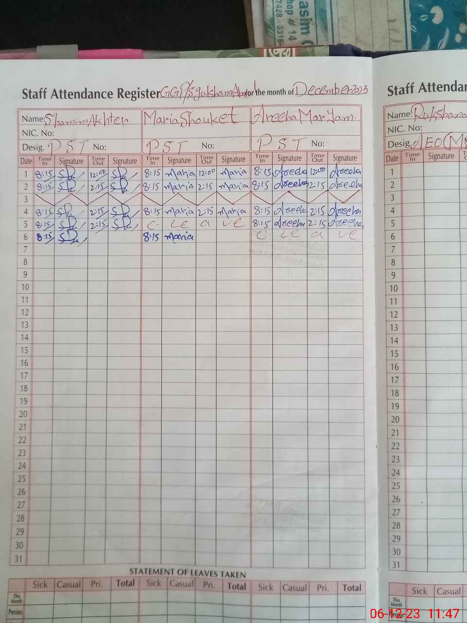 | CNIC | Full Name | Designation | R/C | Absence During Last Calender Month |