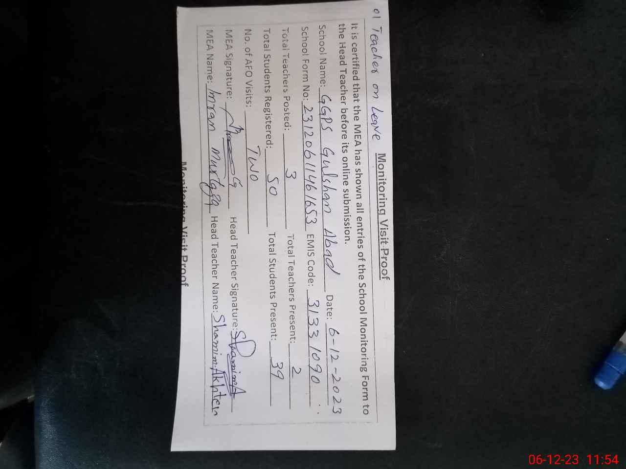 | Attendance Register | Head Teacher | MEA with School | Visit Proof |