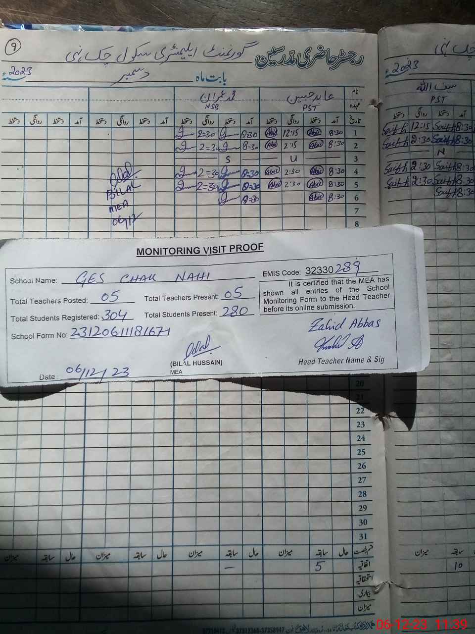 | Attendance Register | Head Teacher | MEA with School | Visit Proof |