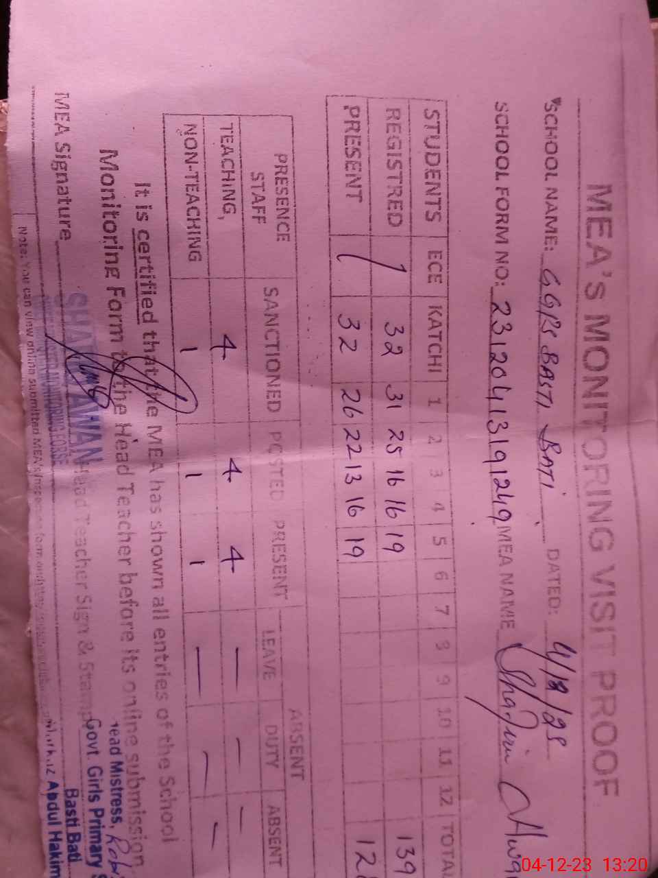| Attendance Register | Head Teacher | MEA with School | Visit Proof |