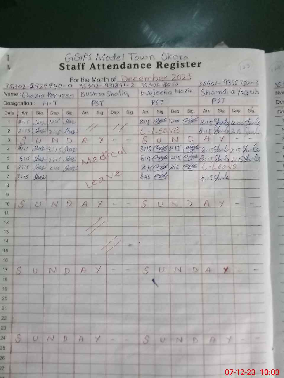 | Remarks (Use Separate Page if Required): Mohabat Ali school guard present in GGPS Model town as Temporary duty who is on posted strength of GGPS Faisal Mehmood colony | |||||