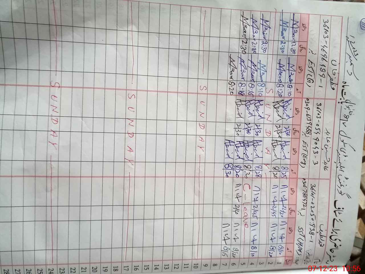 | CNIC | Full Name | Designation | R/C | Absence During Last Calender Month |