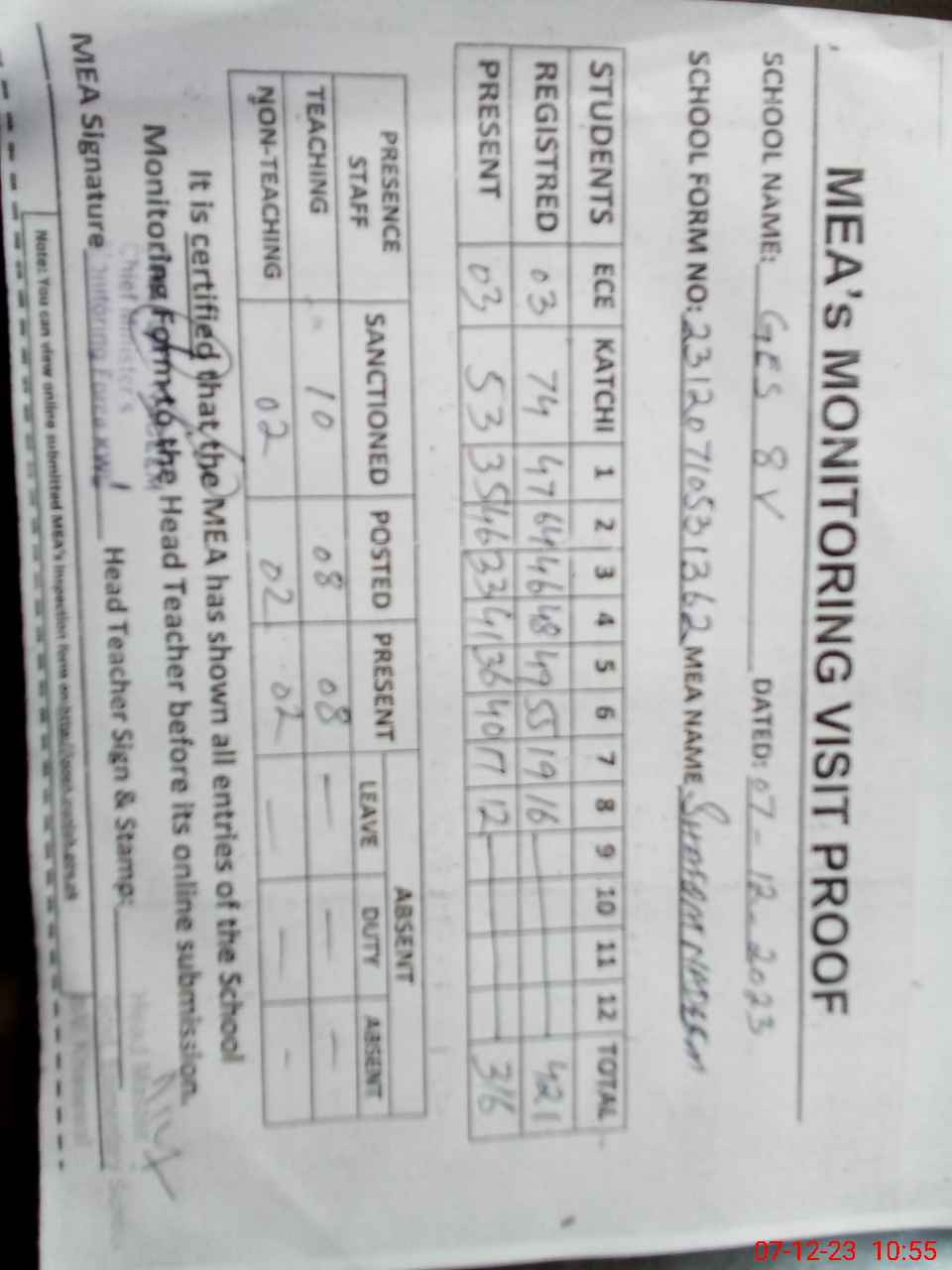 | Attendance Register | Head Teacher | MEA with School | Visit Proof |