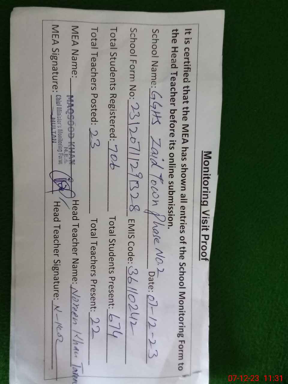 | EMIS Code: 36110242 | Name of School: GGHS ZAID TOWN PHASE NO.2 PIRAN GHAIB ROAD MULTAN | |||
