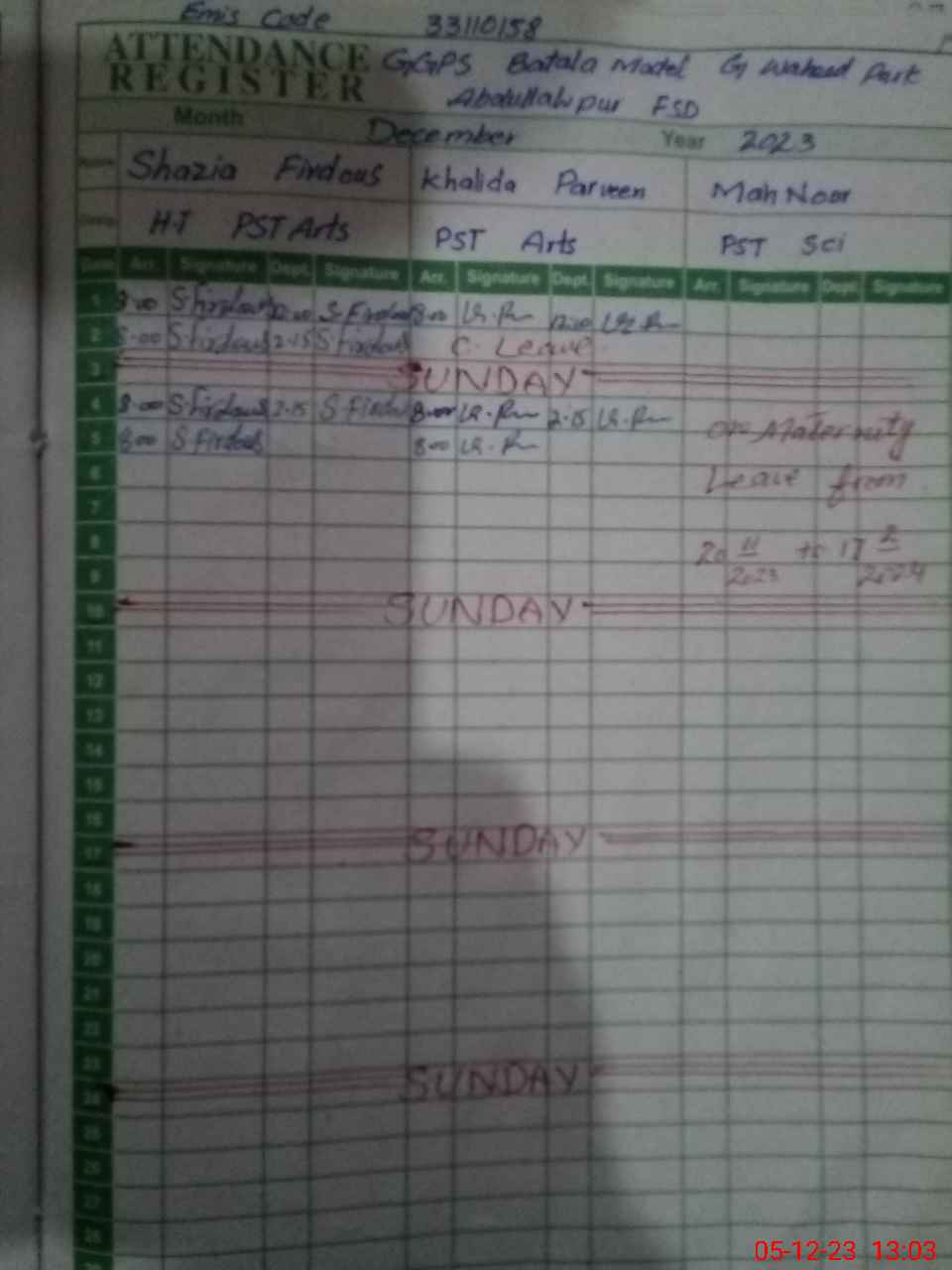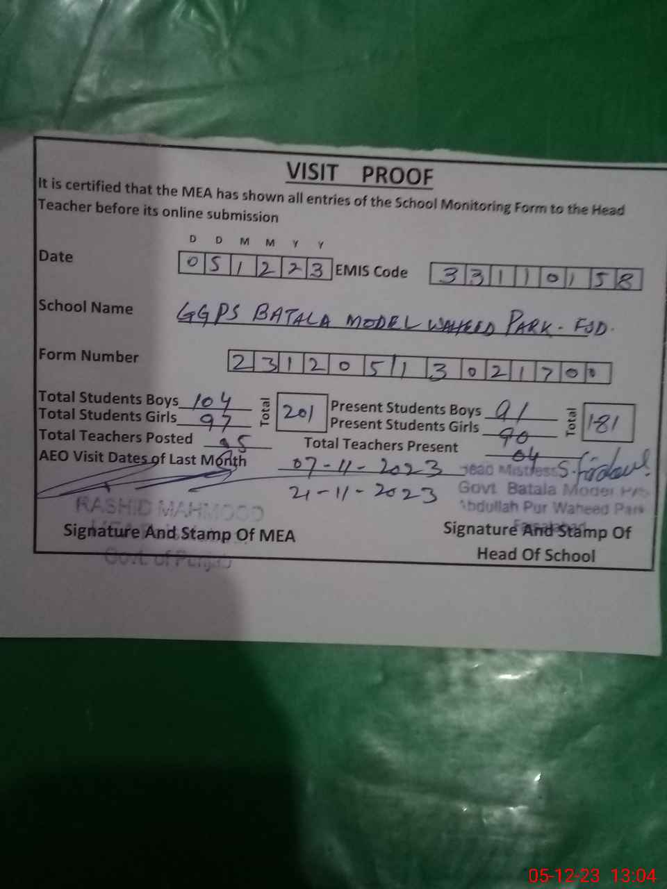 | EMIS Code: 33110158 | Name of School: GGPS BATALA MODEL G WAHEED PARK | |||
