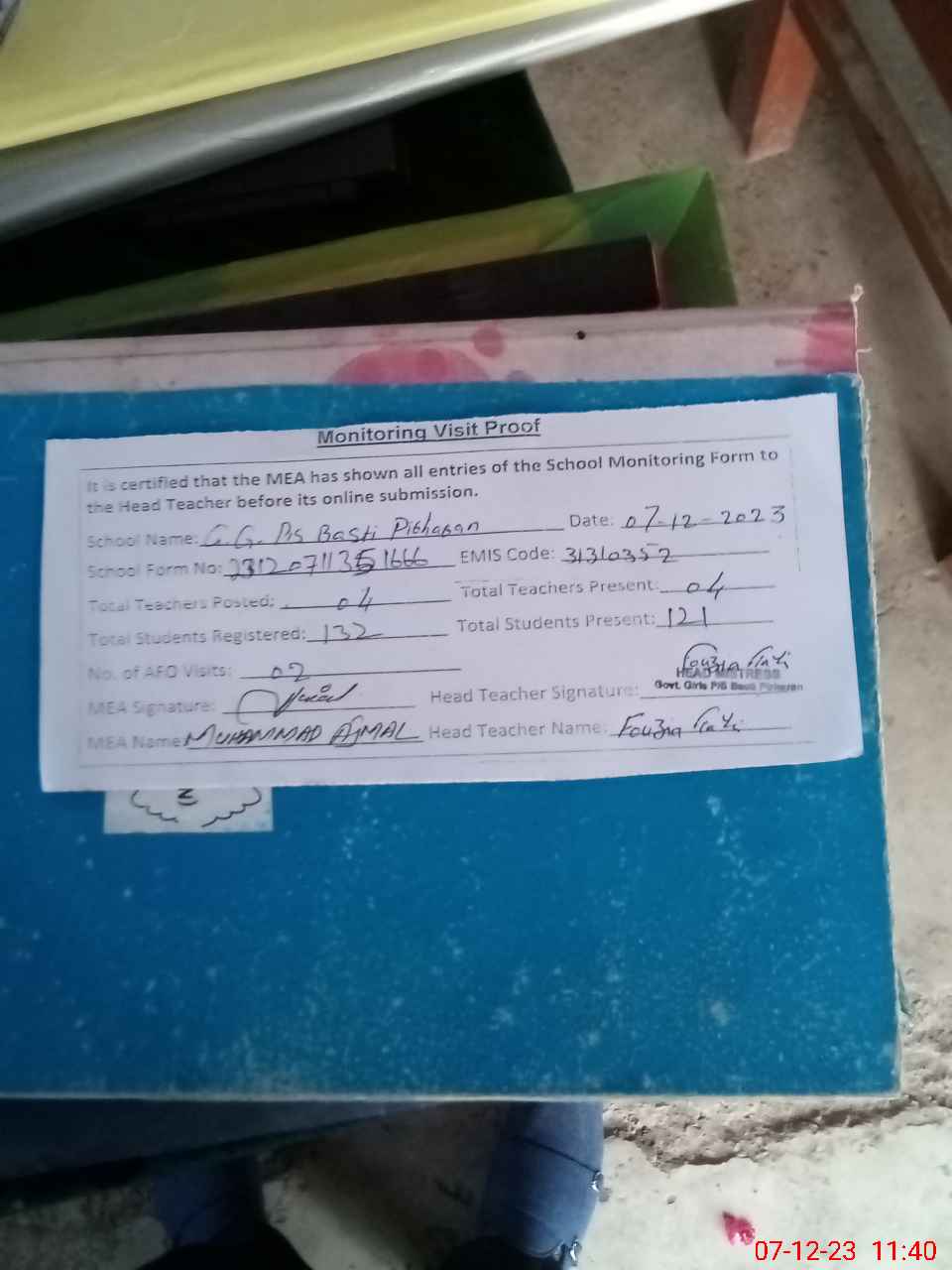 | Attendance Register | Head Teacher | MEA with School | Visit Proof |