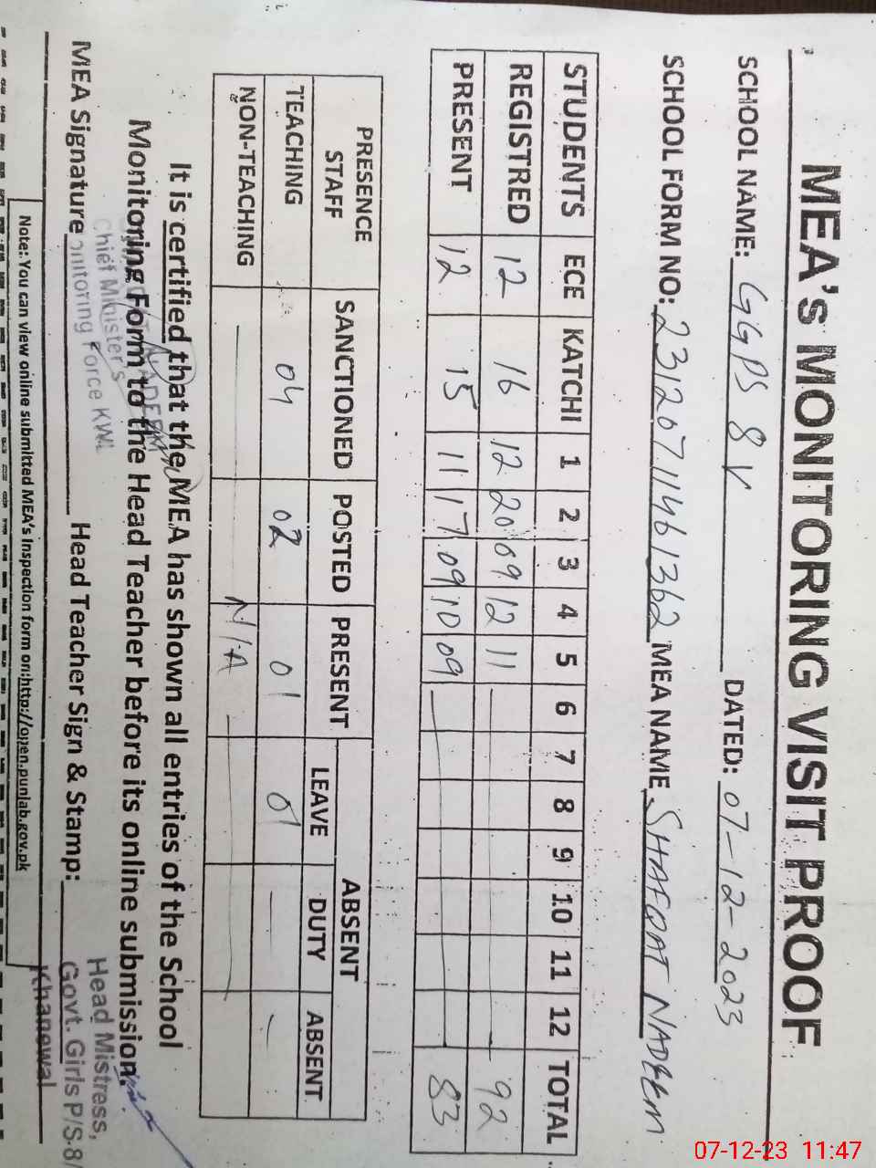 | EMIS Code: 36420381 | Name of School: GGPS 8/V, KHANEWAL | |||