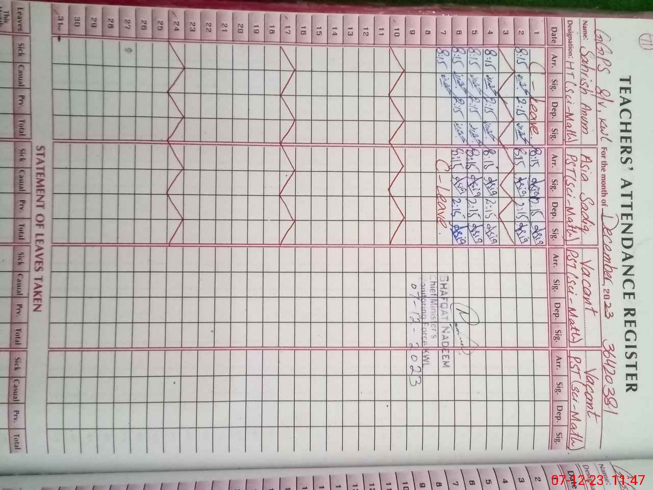 | Remarks (Use Separate Page if Required): Subject school is Insaf Afternoon but there is no afternoon classes and teachers no attendance register of teachers and students of afternoon classes | |||||