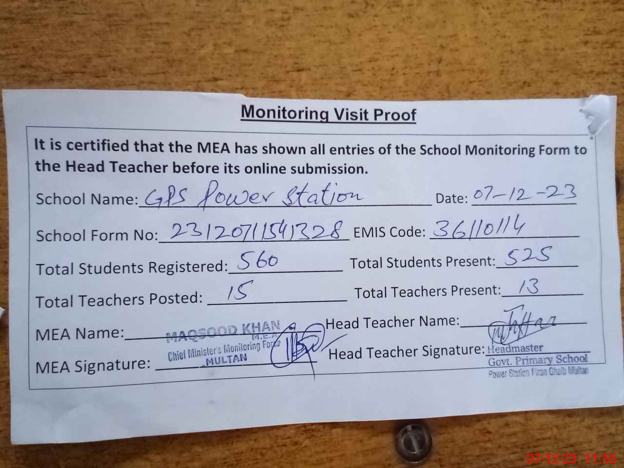 | Monitoring Date: 07-12-2023 | Start Time: 07-12-2023 11:39 AM | End Time: 07-12-2023 11:56 AM | Name of MEA: MA**** ULHA**** KH**** | |