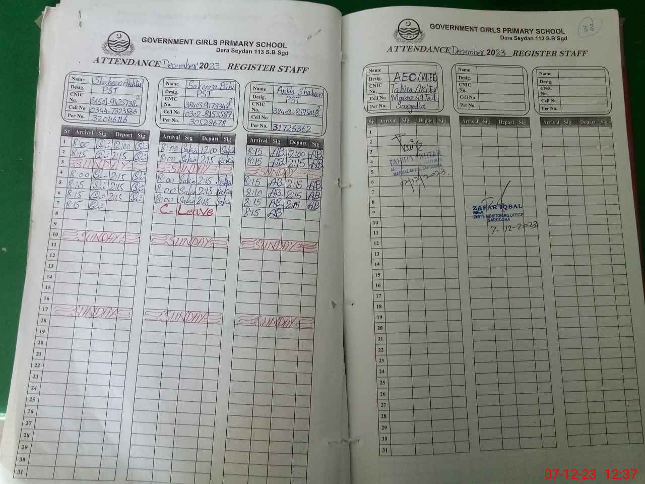 | CNIC | Full Name | Designation | R/C | Absence During Last Calender Month |